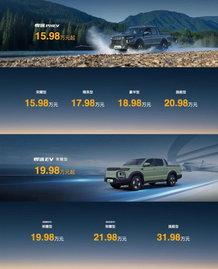 承载美好生活,敢纵万里山河!皮卡新能源化已成为行业必然趋势,悍途PHEV和悍途EV以“千钧之势”奏响华系皮卡新能源化的最强音,不仅满足了多场景用户对高性能、超节能及多功能新能源皮卡的需求,更助力全球皮卡用户迈向绿色高效出行,以“敢纵山河”驰骋全球市场。领潮而立,向新而行!江淮皮卡将砥砺前行,笃行致远,迈向更加广阔的未来!